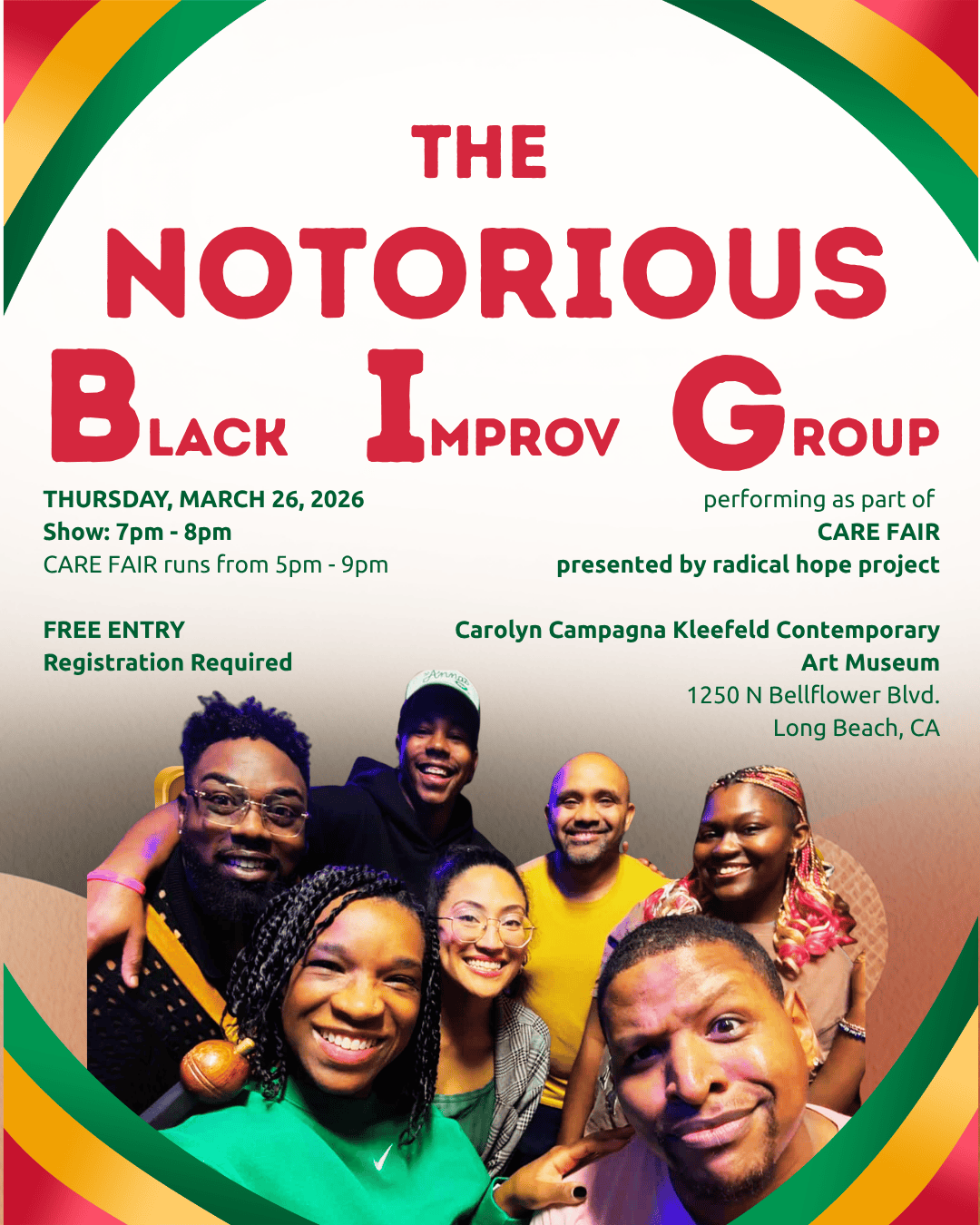 The Notorious Black Improv Group, formed at The Playful Stage, brings bold, joyful, and dynamic improv to the Radical Hope Project’s Care Fair at CSULB. Through a mix of short and long form, the team celebrates Black joy while uplifting stories connected to queer, trans and non-binary, and immigrant communities, reflecting the lived experiences within their ensemble and the Long Beach community. Their performance centers laughter, resilience, and care, creating space for connection, visibility, and shared humanity.