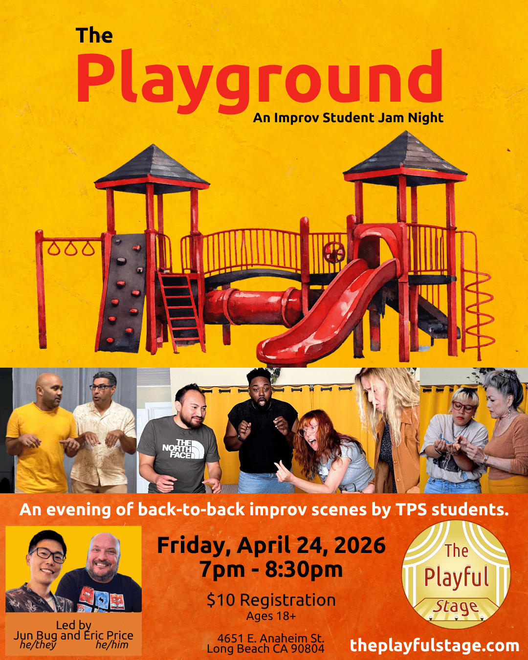 7pm - 8:30pmThe Playground is our TPS improv student jam night, featuring back to back relationship-based improv scenes, providing a dynamic platform for honing improv talents.